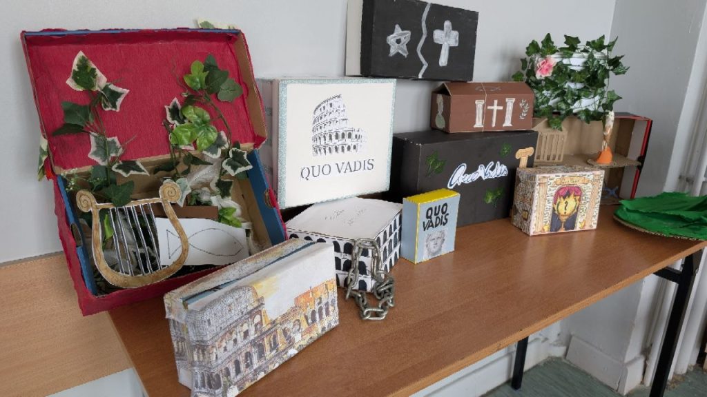 Uczniowie klas siódmych i ósmych przygotowali plakaty oraz pudełka lekturowe inspirowane powieścią „Quo vadis” H. Sienkiewicza. Prace przedstawiały bohaterów, najważniejsze wydarzenia i symbole związane z lekturą. Zajęcia były okazją do rozwijania kreatywności, utrwalania treści książki oraz dzielenia się własnymi interpretacjami Czytaj więcej…